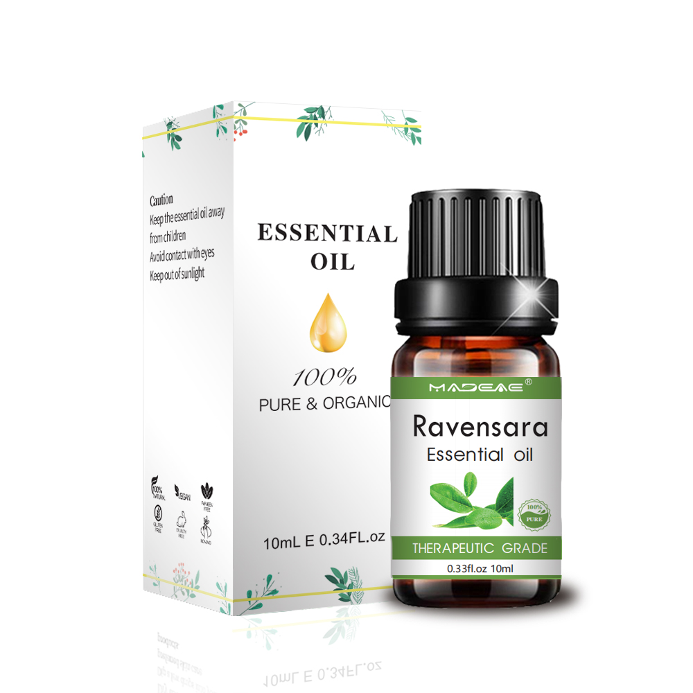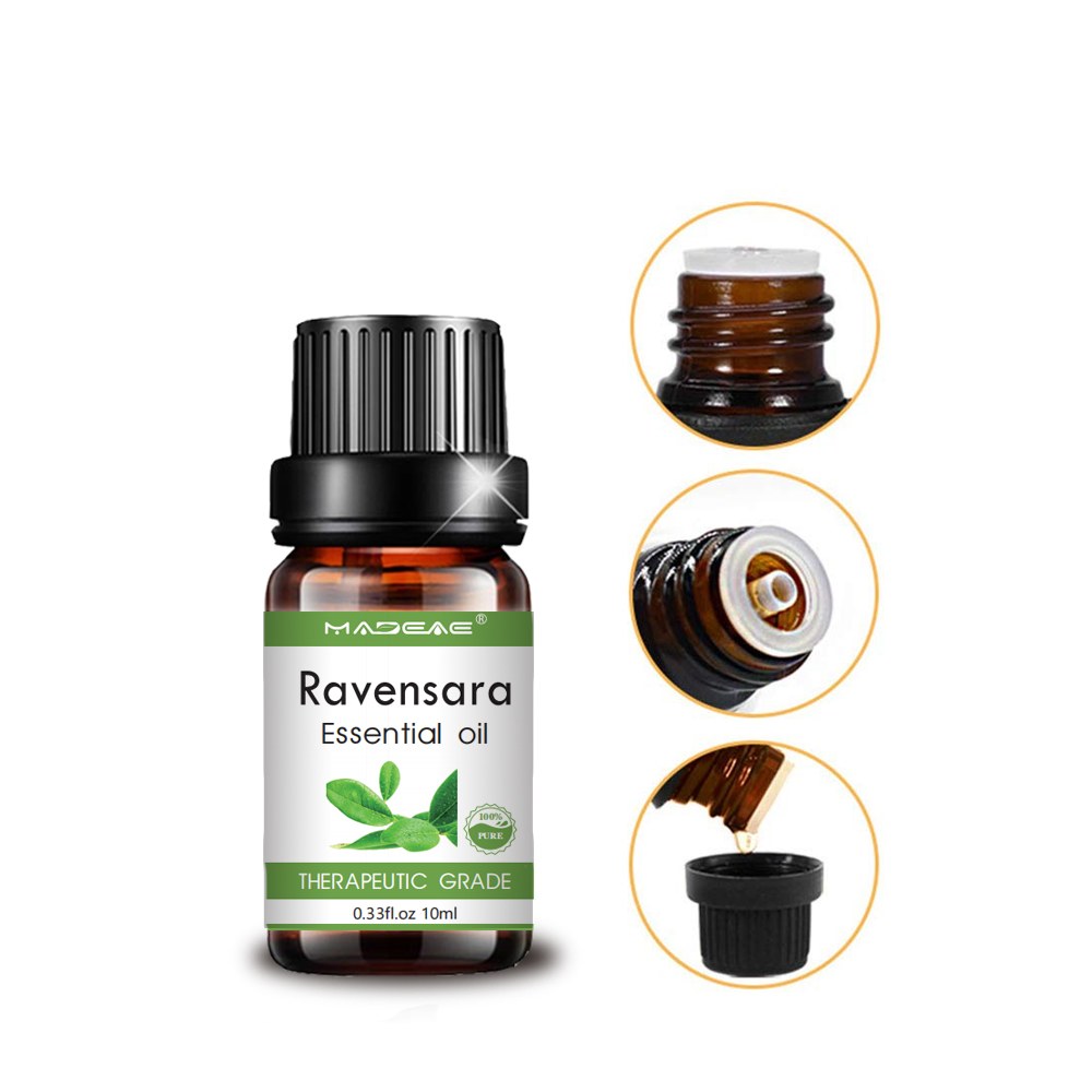 Ravensara leaf oil (Cinnamomum camphora) has powerful antibacterial, antiviral, and immune-stimulating properties, particularly beneficial for the respiratory system. It can relieve symptoms of colds and sinusitis. It also has antibacterial, anti-inflammatory, and calming properties, and can be used for skin care and muscle aches. Its high concentration of eucalyptol can regulate the respiratory tract, boost immunity, and enhance mental focus.